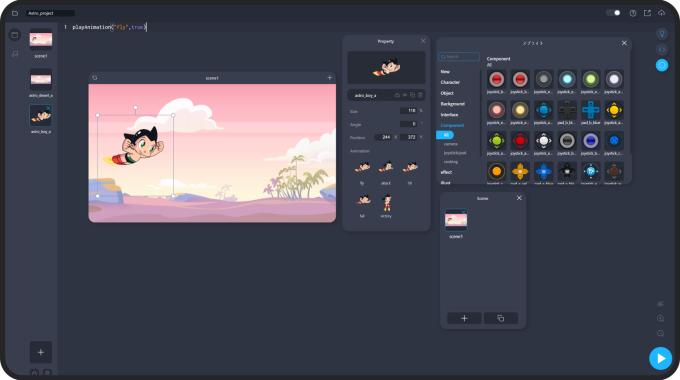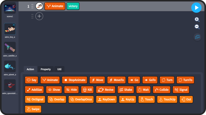 After learning block coding or JavaScript (JS) languages through ACG’s courses, students are able to create their own games using Team Astro characters with the Builder tool.