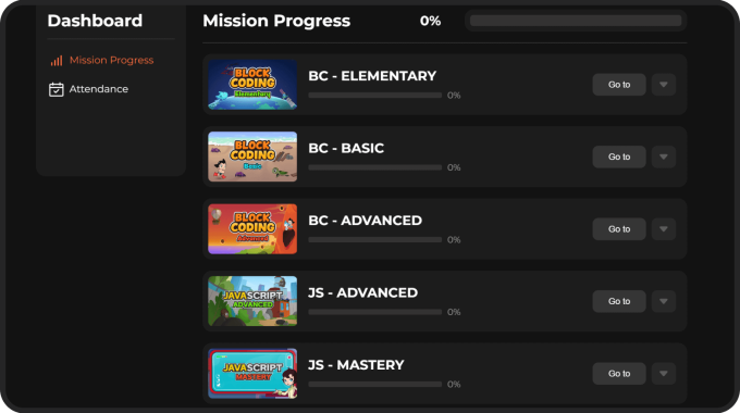 5 Courses of 36 missions teaching block coding and JavaScript, aligned to the global CSTA (Computer Science Teachers Association) standards.